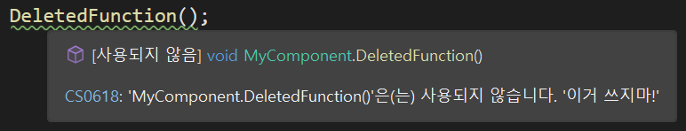 [Obsolete("")] 형태로 작성해 참조 시 표시될 메시지를 직접 정할 수도 있다.